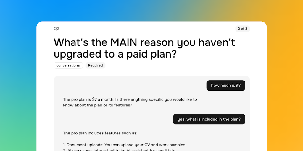Collecting real feedback is hard. Users skip forms, give short answers, or don’t know what to say. Peakforms changes that. Upload your product or idea, and the AI chats naturally, asks the right follo
