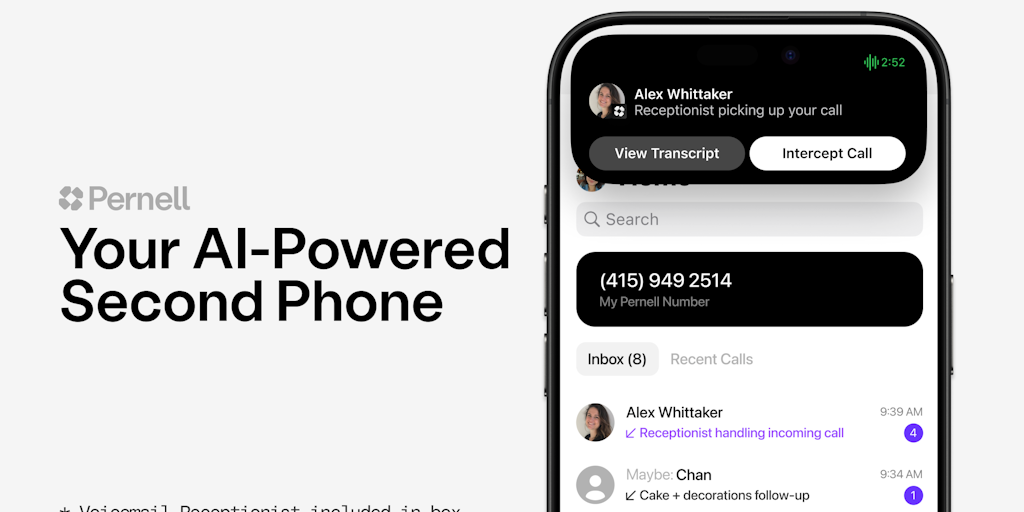 Pernell is your second number, powered by AI. It automatically transcribes, summarizes, and pulls key action items from every call. Miss a call? No problem. Pernell's AI receptionist answers for you.