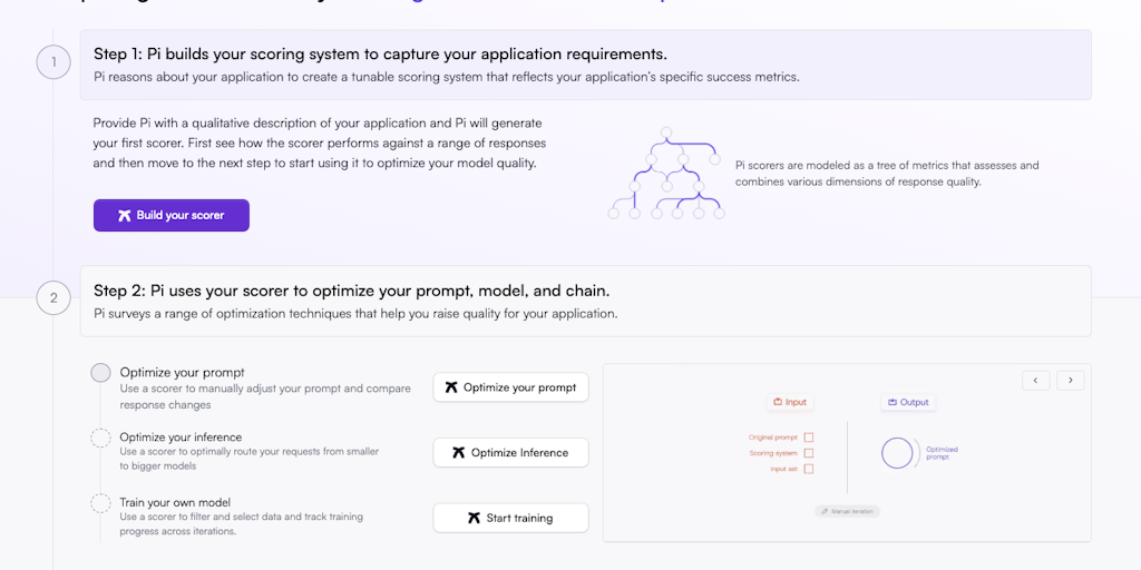 Pi is a toolkit of 30+ AI techniques designed to boost the quality of your AI apps. Pi first builds your scoring system to capture your application requirements and then compiles 30+ optimizers agains