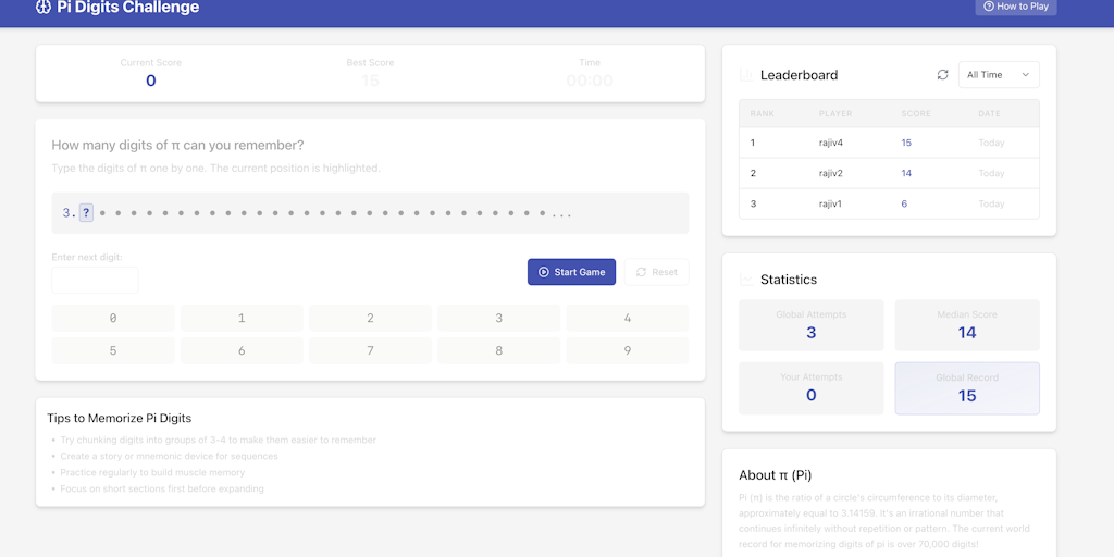 A site where you can test how many digits of Pi you remember, see high scores, and a leaderboard.