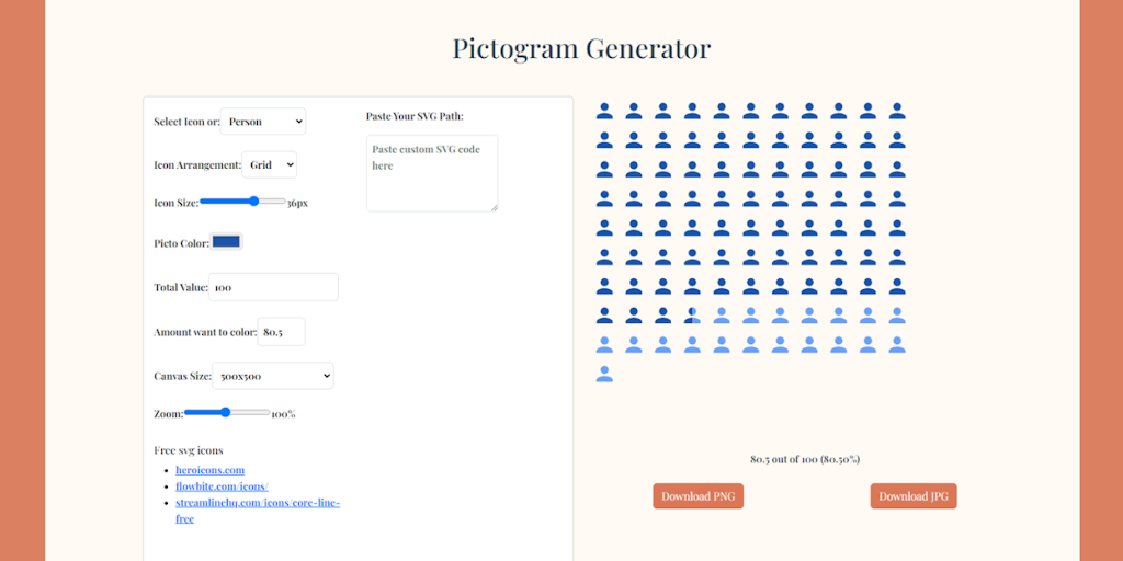 Pictogram Generator: Create stunning pictogram effortlessly! Customize size, color, and layout with ease. Perfect for designers needing quick, high-quality icons for any project. Streamline your desig