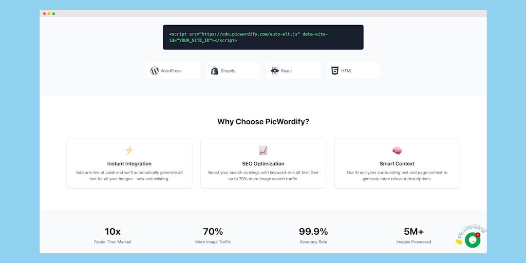 PicWordify is an AI-powered tool that automatically generates accurate alt text for all your images with just one line of code. 🚀 Whether you're using WordPress, Shopify, or any other platform, PicWor