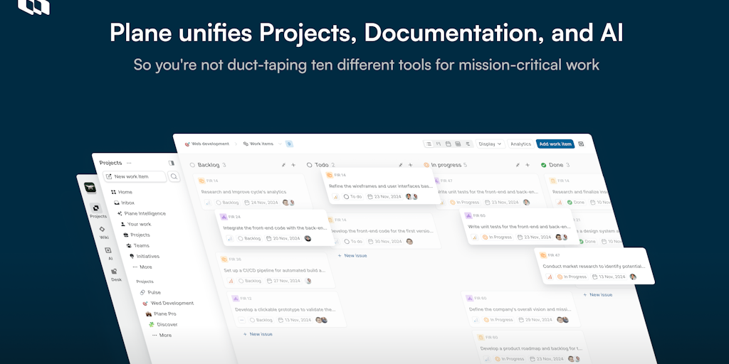 Plane brings your entire org into one workspace where every team is equipped to do their best work, their way. Whether you're tracking projects, writing docs, or using AI to figure work out, it's all