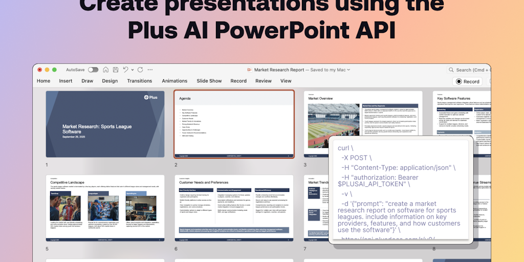 Create professional PowerPoint presentations using the Plus AI API, and embed presentations in your apps and workflows. The Plus AI API generates native PPTX files and supports custom templates and ad