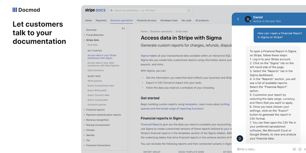 Do you have a documentations website, like docs.stripe.com? With Docmod, we train a ChatGPT bot to have conversations with your users with the knowledge of your documentations website. It takes less t