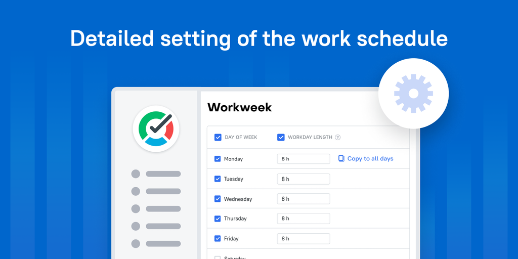 With our help, you can configure your company's work schedule, change the workday length, and pick holidays and additional workdays.