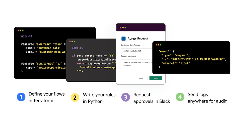 Sym helps developers secure infrastructure and maintain velocity. You get everything you need to implement just-in-time access for your team: a Terraform provider for defining roles, a workflow engine