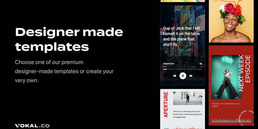 Create stunning social media videos for your audio with Vokal, a simple online video editor. Select audio clips from your podcast, radio show, and music, and add sound waveforms and subtitles to your
