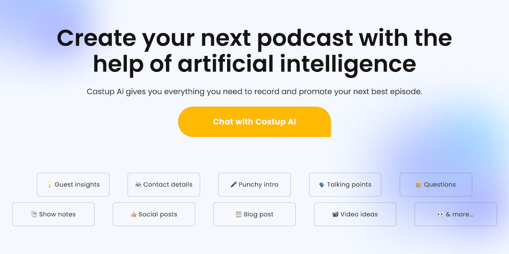 Castup AI is a ChatGPT-powered podcast assistant that can help you record and promote amazing episodes on pretty much any topic with your upcoming (or dream) guests with the help of artificial intelli