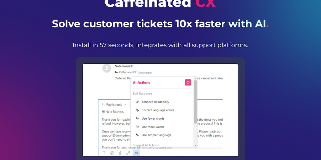 Support reps using Caffeinated CX on Freshdesk resolve 3x as many tickets in the same amount of time. Free 7 day trial.