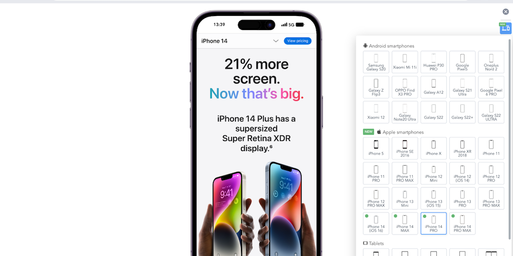 Test your website on smartphones, tablets, and more, with realistic rendering of many devices, including recent and older models of Android, iPhones, and Apple Watches. Record screencasts, capture tra