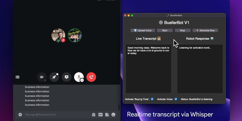 Meet BuellerBot: an open-source AI bot that automates your online meeting presence so you can enjoy what matters. ✏️ Whisper API for live transcript👂 Listens for your name via keyword activation 🧠 Res
