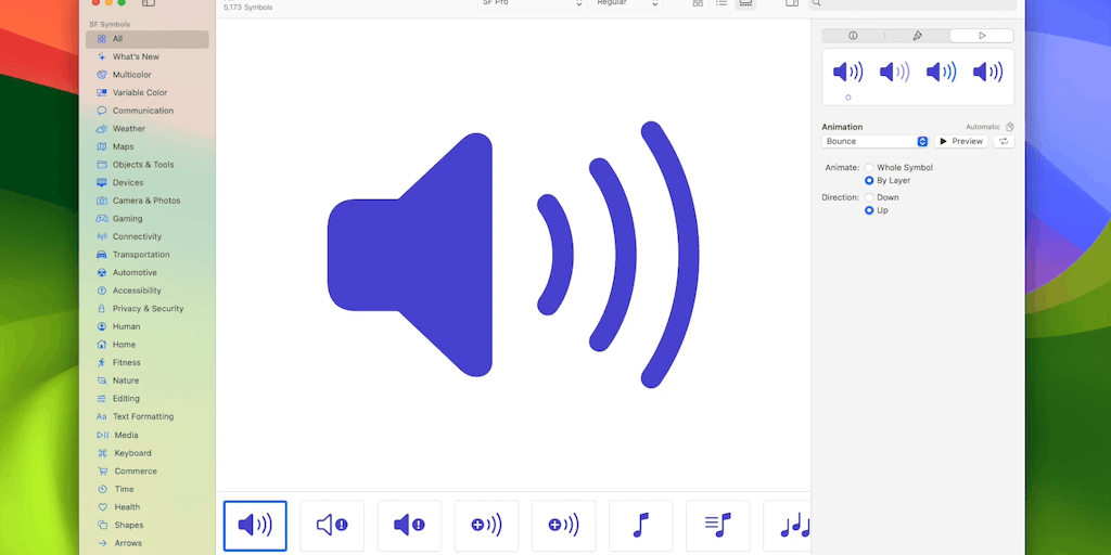 An icon library with 5,000+ symbols that perfectly blend with Apple's San Francisco system font — available in 9 weights, 3 scales, that auto-align with text. SF Symbols 5 adds expressive animations,