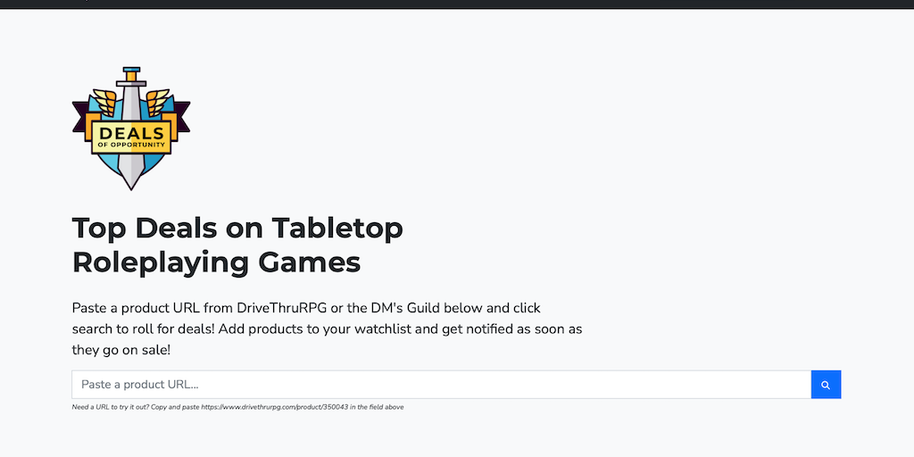 Deals of Opportunity allows users to add DriveThruRPG and The DM's Guild titles to their watchlist and get automatically notified when any of those titles go on sale. Each title also reports historica