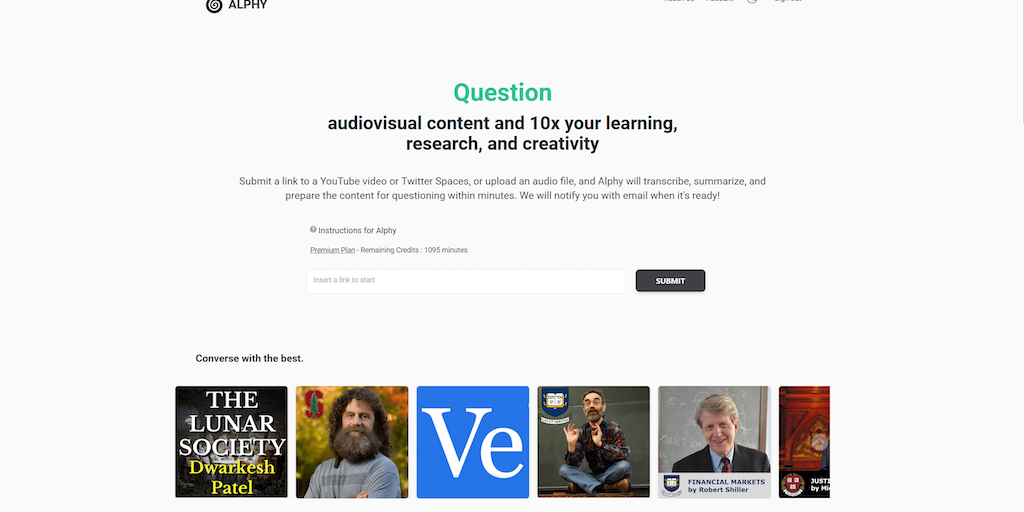 Alphy is your AI-assistant to search, learn, and interact with audiovisual content. Search multiple audio files like searching on Google, read the summaries of videos and discussion like a Substack po