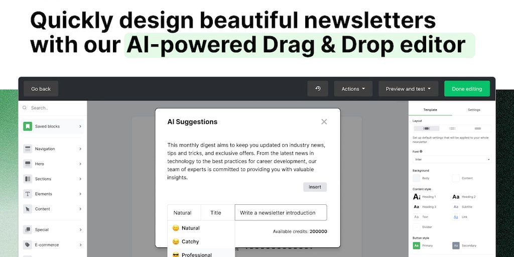 Elevate newsletter creation with MailerLite's new email editor which includes an AI writing assistant for content and subject lines, inline editing, and custom block templates. Now anyone can design a
