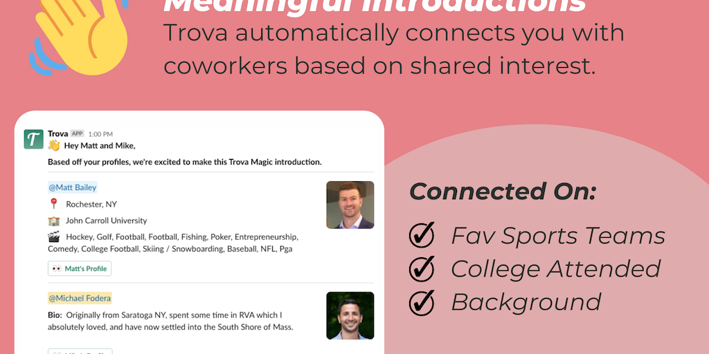 Trova creates inclusive workplaces through social engagement and peer-to-peer learning. Regardless of team or tenure, connect with coworkers who share your interests, skills, or background. Bring your