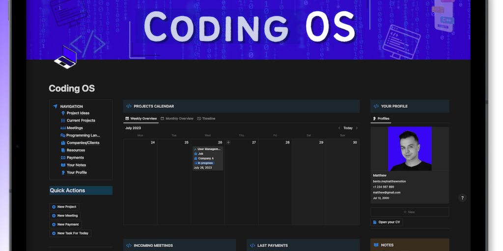 A Notion template for tracking everything associated with coding. Manage your projects, track their progress, programming languages, your resources for coding, payments & much more... Feel free to che