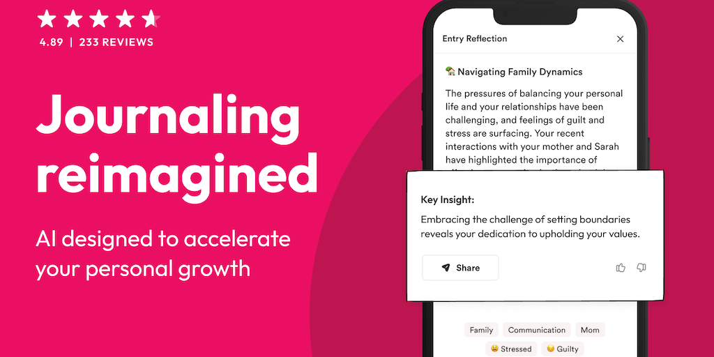 Rosebud is an AI journal designed for personal growth. It's like a mentor in your pocket. Reflect with 10x the power of traditional journaling. Receive personalized questions and insights. Identify an