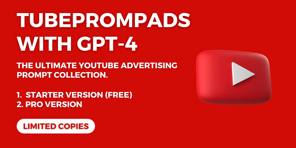 Unlock YouTube's success with TubePrompAds With GPT-4! Get proven prompts for 15 YouTube ad categories, boost views, and elevate your content game. 🚀 #YouTubeAds #ContentCreation