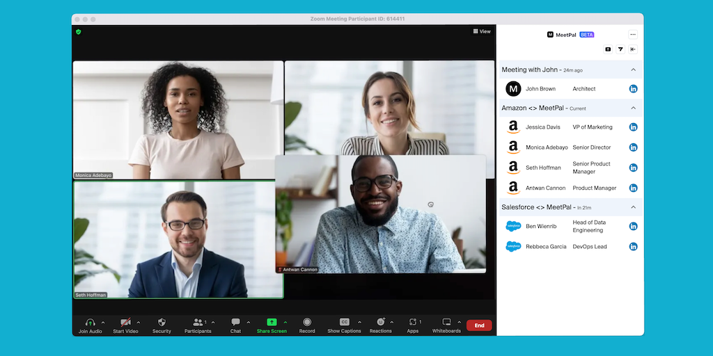 MeetPal is a Zoom meeting assistant that helps you identify with participants in group meetings. It allows you to easily identify each participant's company and role, as well as providing quick access