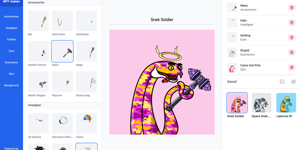 NFT-Inator is a free toolkit to accelerate design and development of procedurally generated NFT projects. Create custom and randomised designs, test your layer combinations, and export images and meta