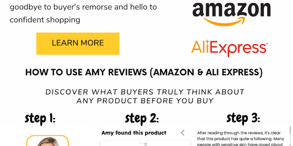 Discover what buyers truly think about any product before you buy with Amy! She expertly summarises millions of reviews from Amazon and AliExpress, saving you time and giving you reliable insights. Sa
