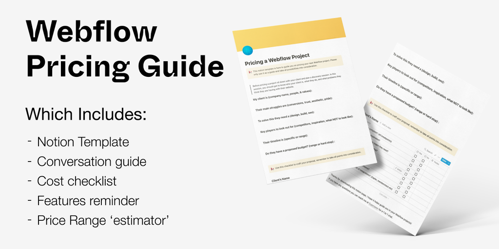 Figuring out how to price your Webflow projects can be a pain. That's why with this notion guide you can have a better understanding of your client's struggles & needs when giving them a price estimat