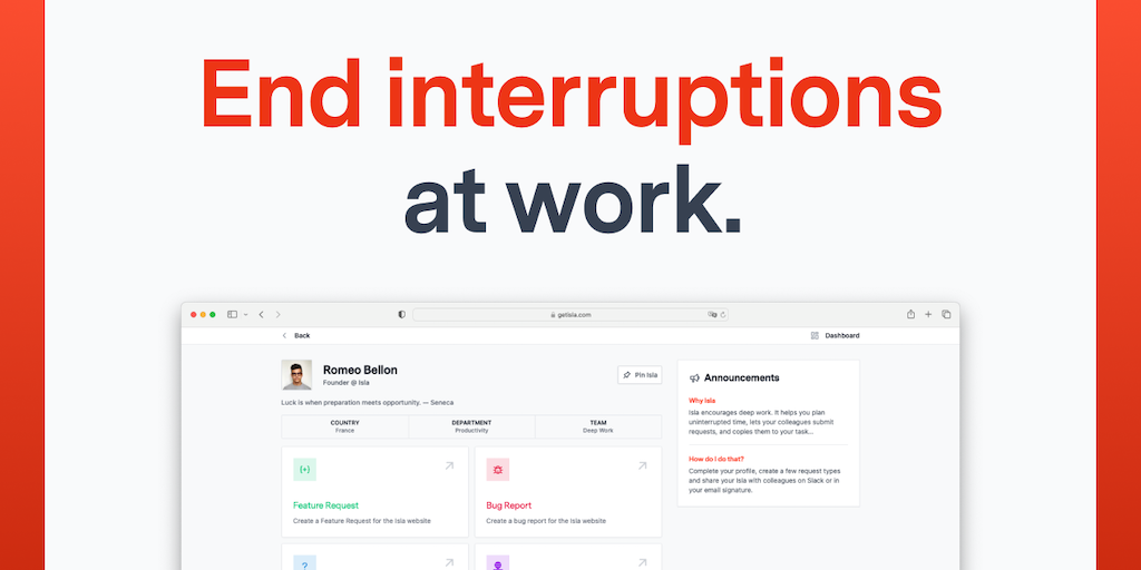 Isla is a tool that lets you centralize, organize and structure your work requests. It makes it easy to ask for assistance and quick feedback for speedy resolutions without creating useless noise in e