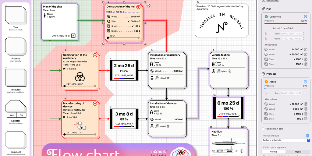 inShort² is an unique technique that will let you see your projects form a bird’s eye view and keep track of every detail. Use inShort² to present your projects, workflows and goals as diagrams