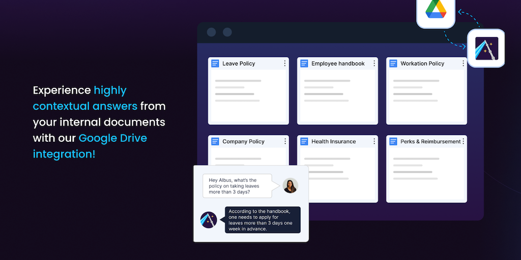Albus absorbs information from your Google Driveᵀᴹ and uses GPT-4 to answer questions with context from your word documents, excel worksheets, PDF files and slide decks. All inside your Slack workspac