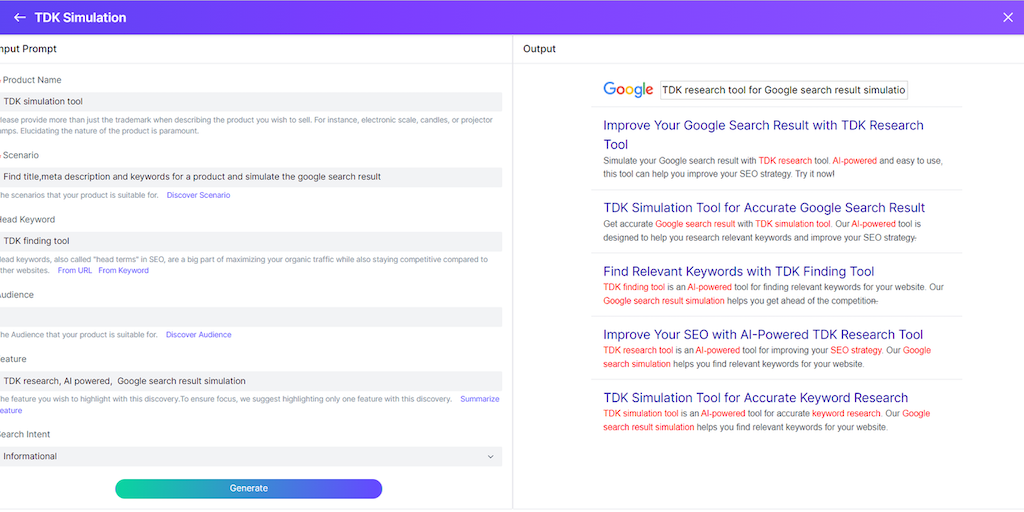 TDK Simulation Tool: Revolutionize your SEO. Generate optimized titles, meta descriptions, keywords, and simulate Google search results. Drive success, effortlessly!