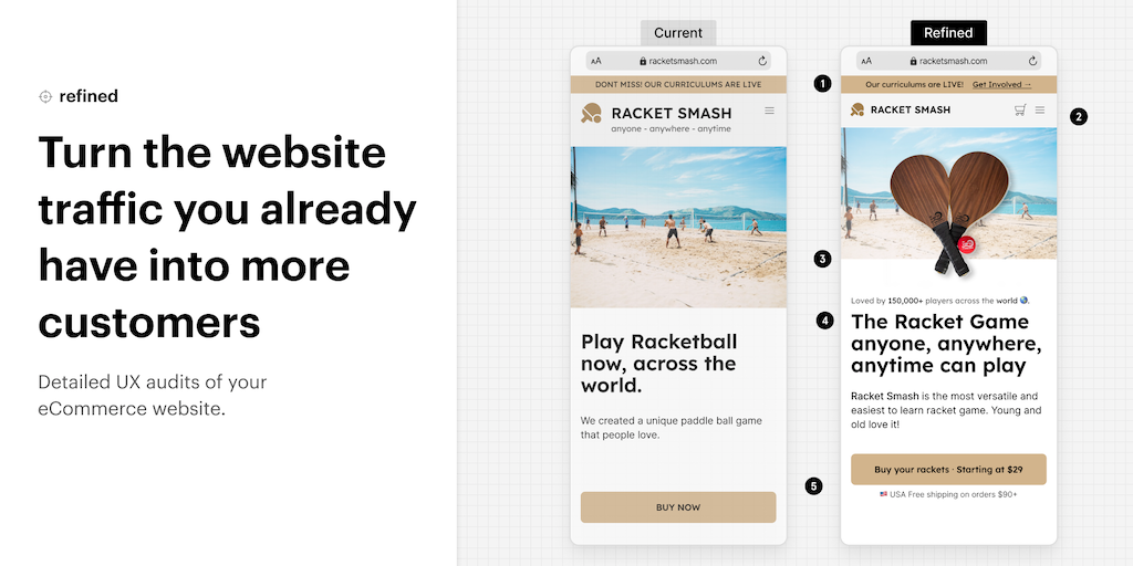 Refined performs detailed UX audits of eCommerce websites to increase your conversion rate (and other marketing metrics). We not only provide actionable suggestions, but real before & after designs in
