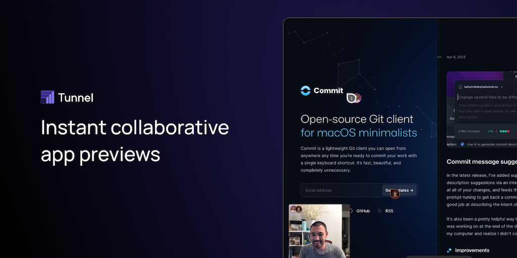 Tunnel is the fastest way to bring your web app online, whether it's for your product manager to review or for a friend to check out. Get a preview URL with one terminal command and collaborate with c