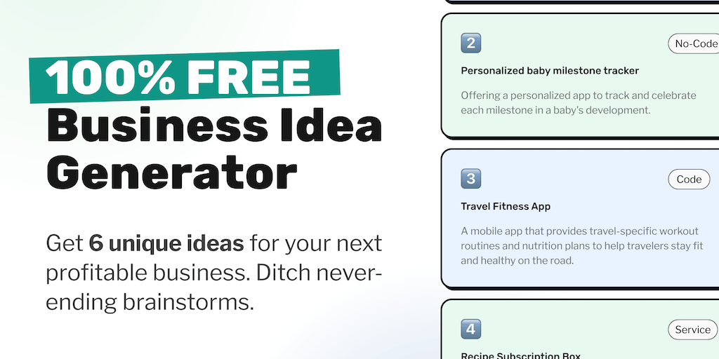 Get 6 unique ideas for your next profitable business. Ditch never-ending brainstorms. Done by AI for busy Solopreneurs. 100% FREE.