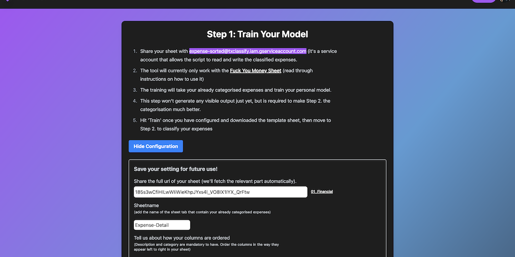 Automatically categorise your monthly expenses using AI. Hook this App up to your Google Sheet and get your monthly budgeting done in no time. Use our Google Sheet Template to get started immediately.