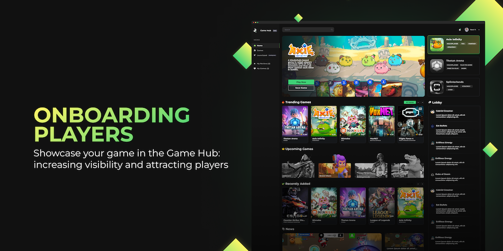 Showcase your game in the Game Hub: increasing visibility and attracting players. A diverse selection of traditional and Web3 games awaits your discovery.