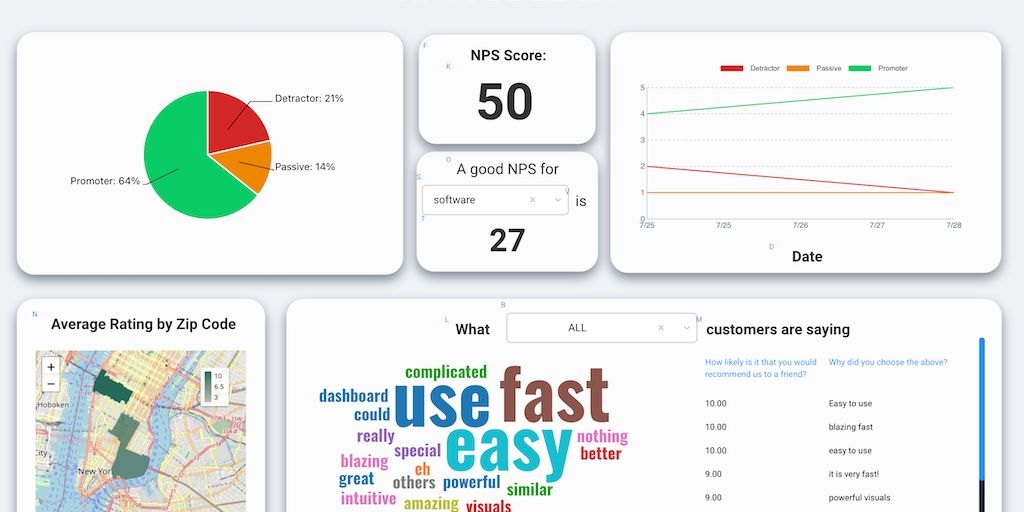 NPS survey: easily edit and send your survey to your customers or administer directly as a mobile app Analytics dashboard: fully customizable visual display of your customer’s responses