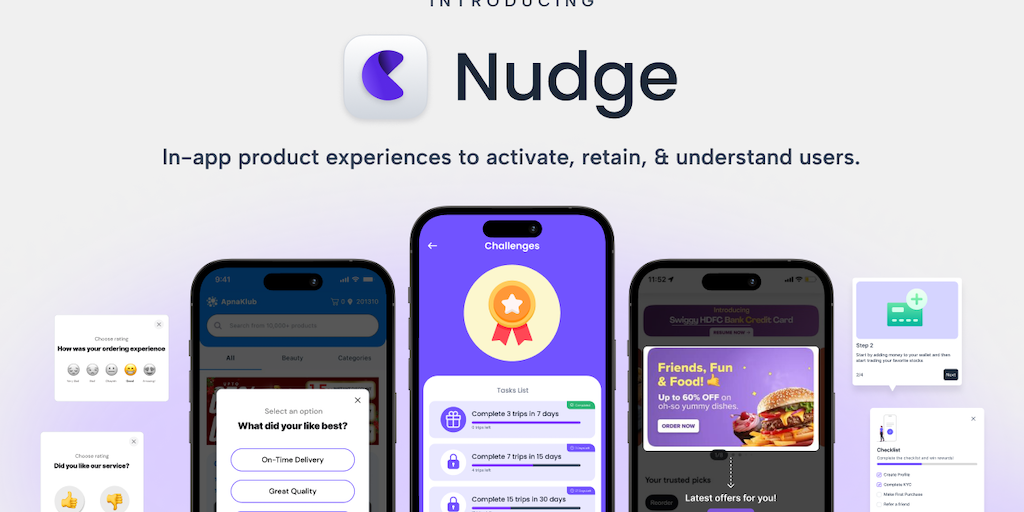 Nudge is an in-app product experience platform for consumer companies to help them activate, retain, & understand users. So think of walkthroughs, tooltips, challenges, and surveys inside user journey