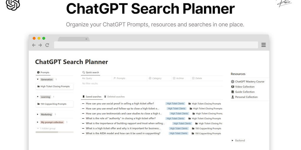 The Ultimate Search Planner to organize and streamline ChatGPT searches, prompts and resources in one place, digitally.