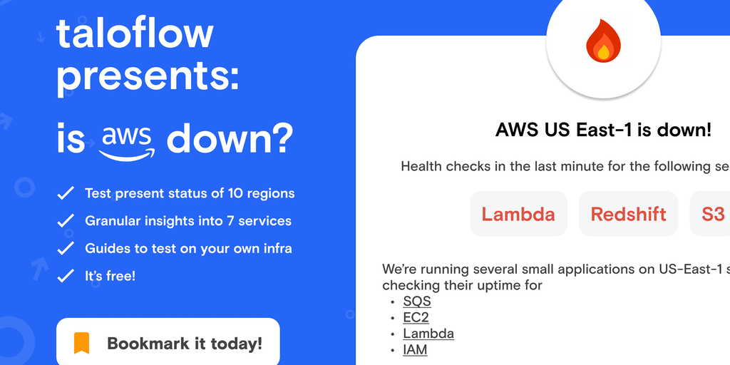 Is AWS Down? by Taloflow is a free AWS outage/uptime checker that performs thousands of health-checks every day on the most popular AWS services and regions so you never have to wonder again: is AWS d