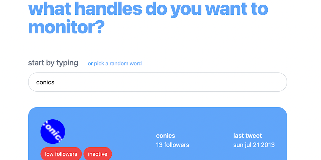👀 twitter is going to free up 1.5 billion inactive accounts, including many with awesome usernames, like @theatre features: * monitor desired handles, and be alerted when they drop * identify handles