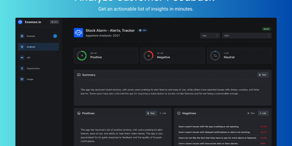 Essense empowers product owners to make data driven decisions based on user feedback. Effortlessly analyze thousands of reviews in minutes, and stay ahead of the competition.