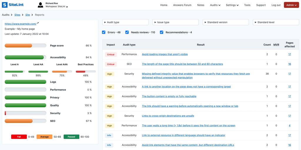 Perform site audits to determine issues that impact SEO, Performance, Accessibility, Security, and Quality. All audits are performed client-side, real-time, which means real users, real networks, and