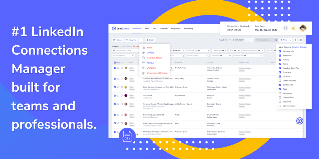 LeadDelta helps you become proactive about your most valuable asset – your relationships. 🗂 Centralize all your LinkedIn contacts in one place. 🗝 Unlock data & signals. 🏷 Filter, sort, tag & organize.