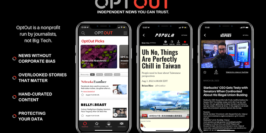 OptOut is a free news aggregation app that brings you the best of independent media. Read, listen to, and watch news content from financially independent sources—news you won’t find anywhere else.