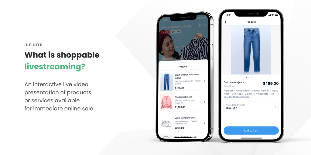 Infinite is a white-label SaaS product combining live commerce, video sharing, and audience engagement tools. Our interactive shoppable live streams can be easily integrated into web and mobile online