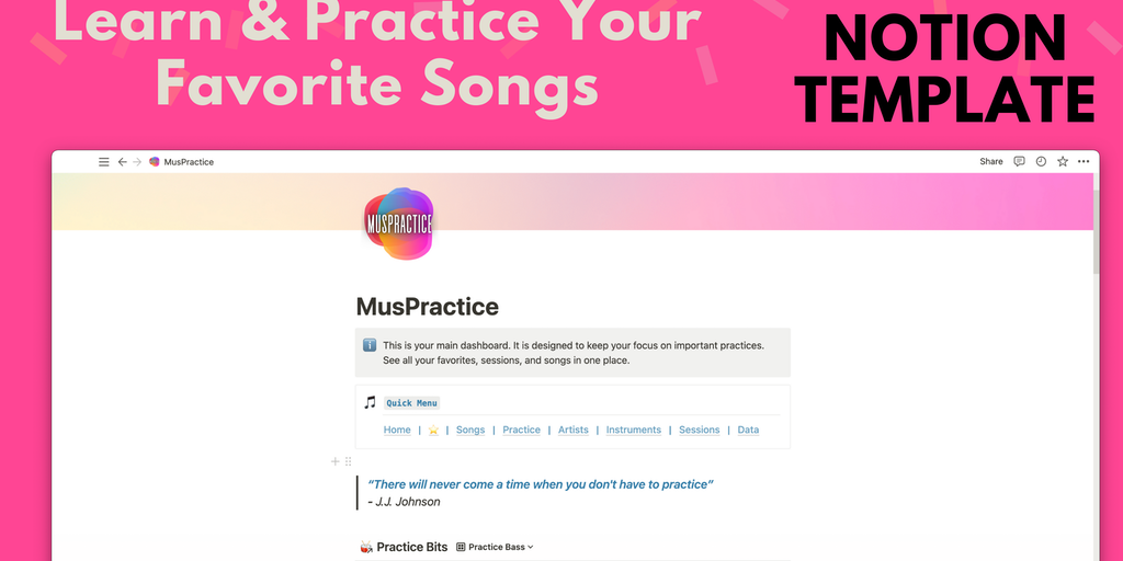 🎵 Keep track of your music practice with MusPractice. This template includes a Notion dashboard for tracking your guitar, bass, piano, and drum practice. 👉 Track your practice time 🎤 Store your music