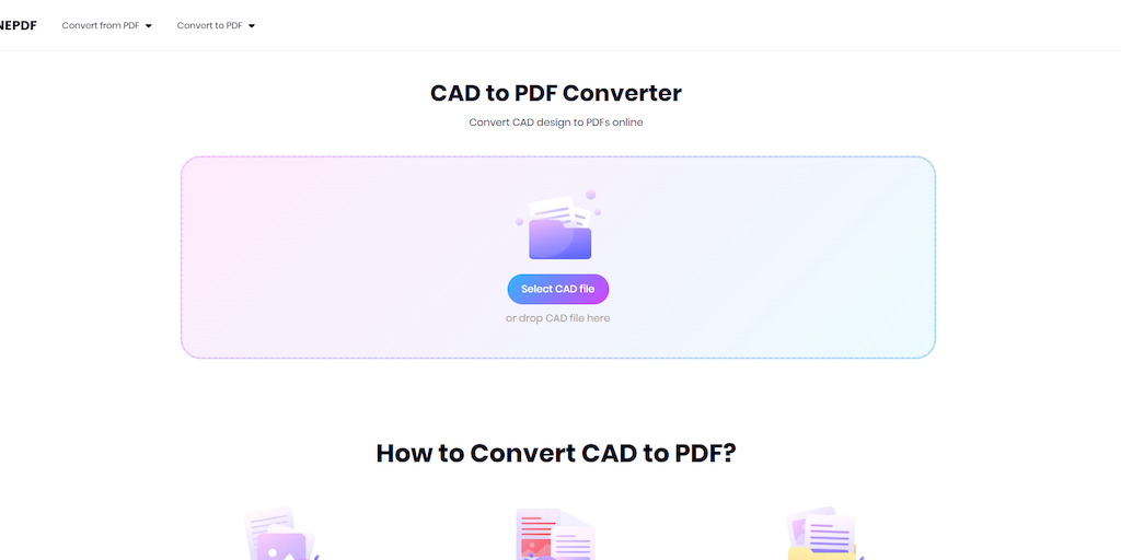 ONEPDF's CAD to PDF converter is an efficient and user-friendly online tool that allows users to convert AutoCAD files into PDF documents quickly and accurately, including DWG, DXF, DWT, DWS, etc.