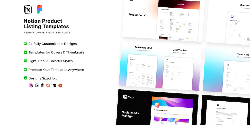 Selling Notion templates? This pack of 24 customizable Figma templates takes the hassle out of designing for beginners and advanced Notion creators alike so you can easily create beautiful graphics to
